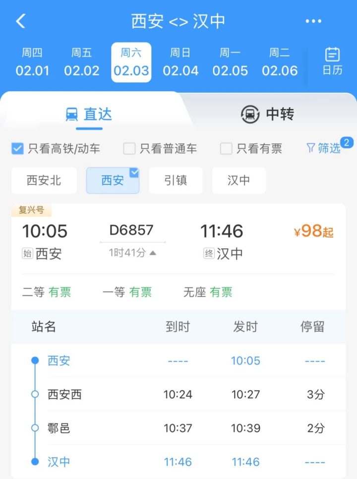 漢中站?西安站,可直達(dá)火車站! 文化旅游 漢中在線 2024-01-31 17:20 為了方便旅客自2024年2月3日起從漢中乘高鐵可直達(dá)西安火車站西安—漢中D6857次(西安10:05開(kāi),西安西10:24到10:27開(kāi),鄠邑10:37到10:39開(kāi),漢中11:46到。)漢中—西安D6852次(漢中7:33開(kāi),城固北7:45到7:47開(kāi),洋縣西7:56到7:58開(kāi),佛坪8:17到8:19開(kāi),鄠邑8:51到8:53開(kāi),西安西9:03到9:05開(kāi),西安9:26到。) 溫馨提示D6857次列車的始發(fā)站為西安站從漢中始發(fā)的D6852次列車的終到站為西安站其他的從西安前往漢中的高鐵列車乘車站點(diǎn)為西安北站“西安站”“西安北站”雖然只有一字之差但并不是一個(gè)站兩個(gè)車站直線距離約11公里請(qǐng)廣大旅客在購(gòu)票時(shí)注意區(qū)分不同車次的始發(fā)站和終到站避免買(mǎi)錯(cuò)車票影響行程安排來(lái)源:漢中發(fā)布 70 贊